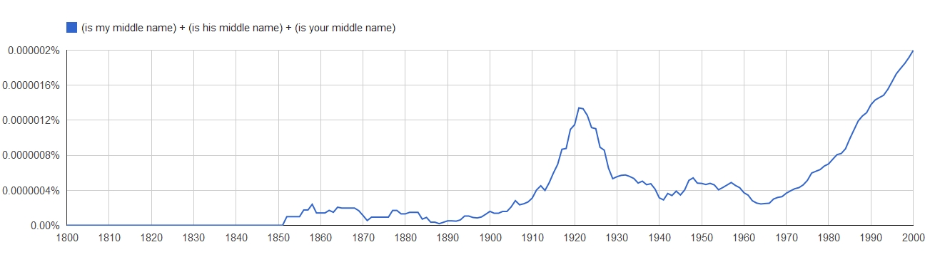 That spike peaking right around 1920 is really interesting; equally interesting is that thereafter, it drops back down to relatively modest levels until the 1960s, and then takes off again, reaching its historical peak in the late 1980s and keeping right on going. Now, it’s clear that the initial rise starts well before World War I, so this isn’t something directly associated with soldiers’ slang or the general mixing of dialects during and after the war, but looking at the Google Books results around 1920, this really seems to have been a fad at the time – most of the uses of “is [pronoun] middle name” are non-literal. But by the time that Agatha Christie wrote, in The Murder of Roger Ackroyd (1926: 144), “‘Modesty is certainly not his middle name.’ ‘I wish you wouldn’t be so horribly American, James.’”, the fad was already on the wane – although it never disappeared entirely, for the next several decades it was quite rare.