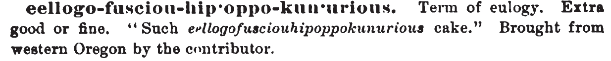 A short while ago, when I created my Long Words page on the Phrontistery, I returned to the vexing subject of the origin of eellogofusciouhipoppokunurious and after a couple minutes’ searching, turned up this entry over at the wonderful Futility Closet, which at least gave me a source in an actual dictionary, Weseen’s Dictionary of American Slang, but seemed unlikely to go further.  A search on Google Books produced a couple of false positives (no, it wasn’t really used in some novel from 1845), some modern reuses (analogous to my Slang Teasers), and one from a 1934 review of Weseen’s dictionary. Nevertheless, I tracked down a copy of Weseen’s dictionary, which I just got on Thursday from my friendly interlibrary loans department, and sure enough, there it is, defined as ‘very good; very fine’ but with no further information.