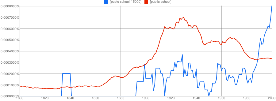 Secondly, pubic school has a long history, at least according to the Ngram; setting aside that blip in the 1830s, we still have over a century of pubic schools. Looking through the actual sources, though, a lot of these are OCR-related errors in the Google corpus – for instance, some are actually the typo publc rather than pubic, and others aren’t errors at all in the original text, but just Google’s OCR having an off-day.