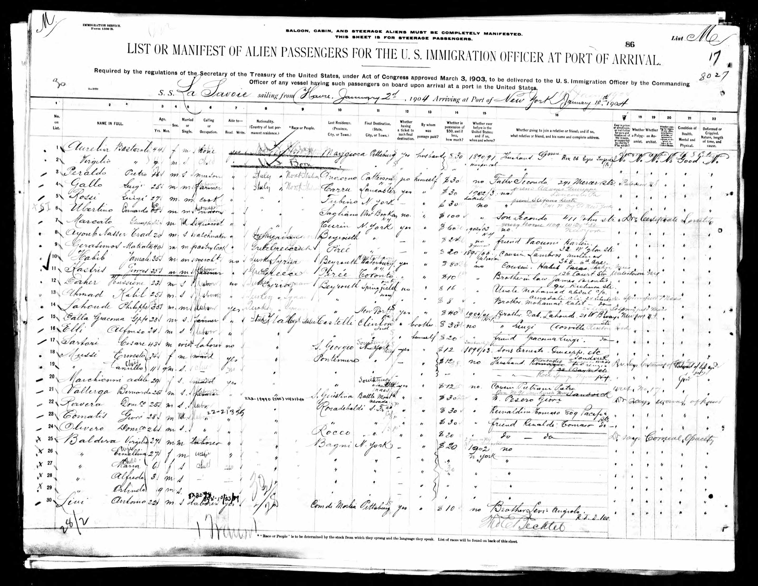 List or manifest of alien passengers, S.S. Savoie, Port of New York, Jan. 10, 1904
